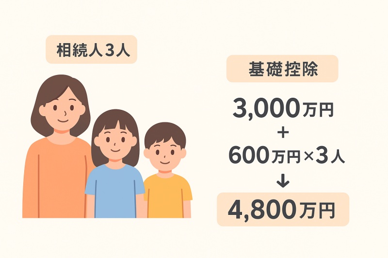 例えば、相続人が妻と子2人(計3人)の場合、基礎控除額は4,800万円(3,000万円+600万円×3人)となります。